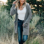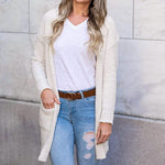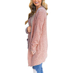 - Key features: Soft popcorn yarn, relaxed boyfriend style, open front, spacious pockets, below-hip length